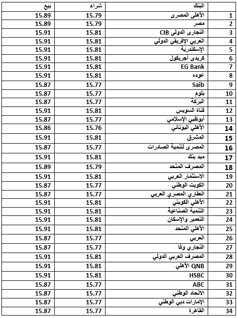وفي مسح  أجراه " بنكي" شمل 34 بنكًا عاملًا بالسوق المصرية، سجل أقل سعر لصرف الدولار في بنوك (بلوم – البركة – أبوظبي الإسلامي – saib – المصري لتنمية الصادرات – الكويت الوطني – العقاري المصري العربي – القاهرة – الاتحاد الوطني) عند مستوى سعر 15.77 جنيهًا للشراء، 15.87 جنيهًا للبيع.