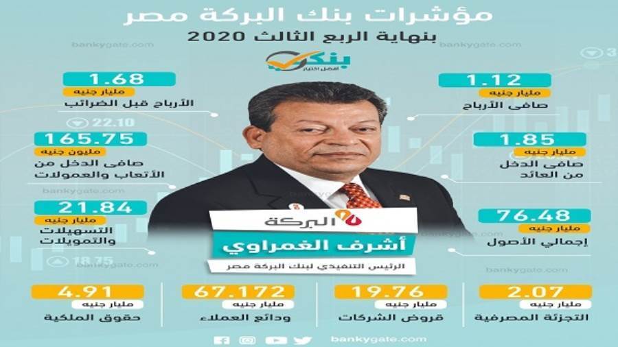 ويعرض «بنكي» في الإنفوجرافيك التالي مؤشرات بنك البركة مصر بنهاية الربع الثالث من 2020.