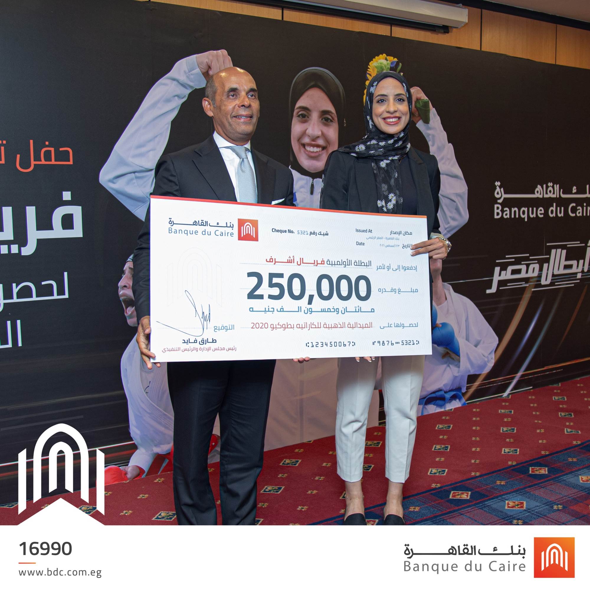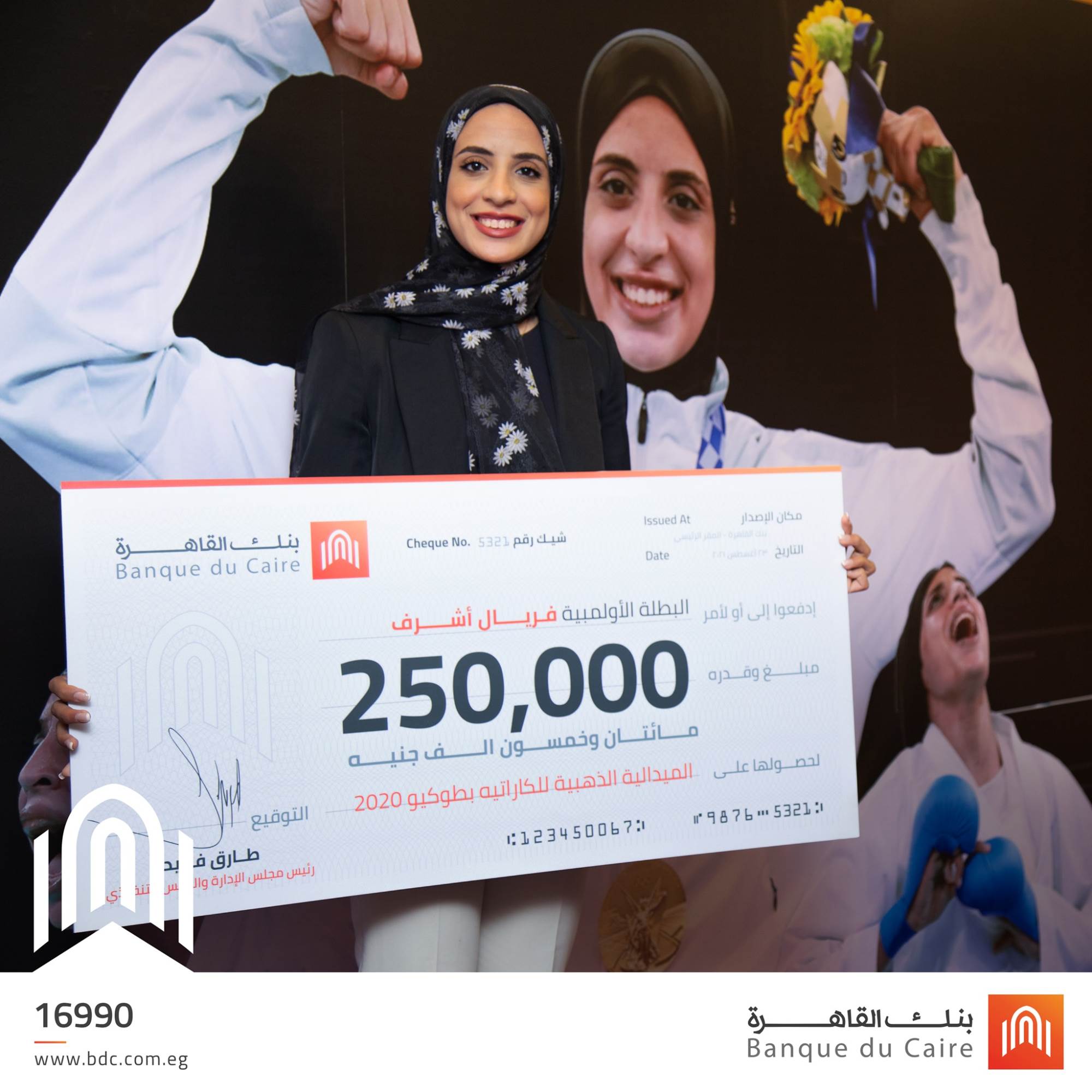 أعلن بنك القاهرة عبر صفحته الرسمية على موقع التواصل الاجتماعي «فيسبوك»، عن تكريمه لبطلة مصر الأولمبية في رياضة الكاراتيه فريال أشرف، بعد حصولها على الميدالية الذهبية للكاراتيه بأولمبياد طوكيو 2020.