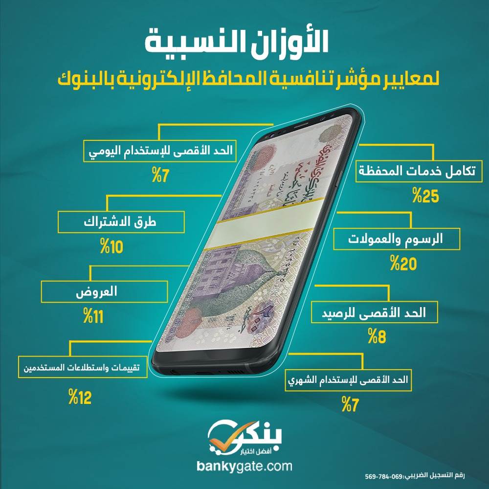 ووضع «مركز بحوث بنكي» وزن نسبي لكل معيار من المعايير، بناء على تحليل تطلعات العملاء ودراسة السوق، ليتم بعدها صياغة مؤشر مُركب، يعتمد في حساباته على الأوزان النسبية للمعايير وهو مؤشر تنافسية المحافظ الإلكترونية، وتم إعطاء درجة لكل محفظة من 100% بناء على نتائج المعايير وترجيحها إلى أوزانها النسبية.