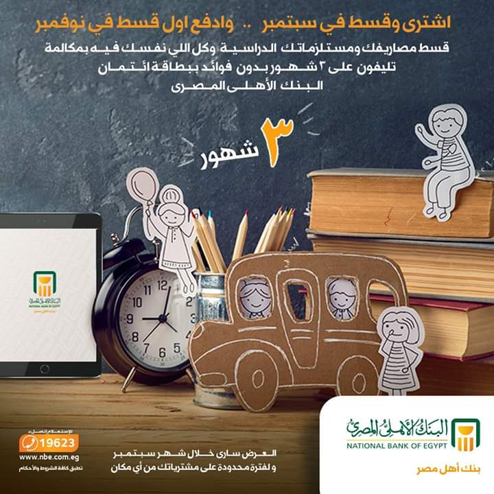 الأهلي المصري إمكانية تقسيط المصاريف والمستلزمات الدراسية على 3 شهور بدون فوائد.