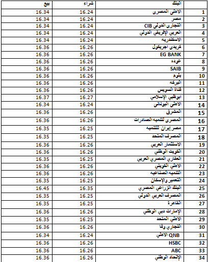 وفي مسح أجراه " بنكي" شمل 34 بنكًا عاملًا بالسوق المصرية، سجل أقل سعر لصرف الدولار في البنوك التالية: (الأهلي المصري – مصر–CIB – العربي الإفريقي الدولي - الإسكندرية –QNB الأهلي – الأهلي اليوناني) عند مستوى 16.24 جنيهًا للشراء، و16.34 جنيهًا للبيع.