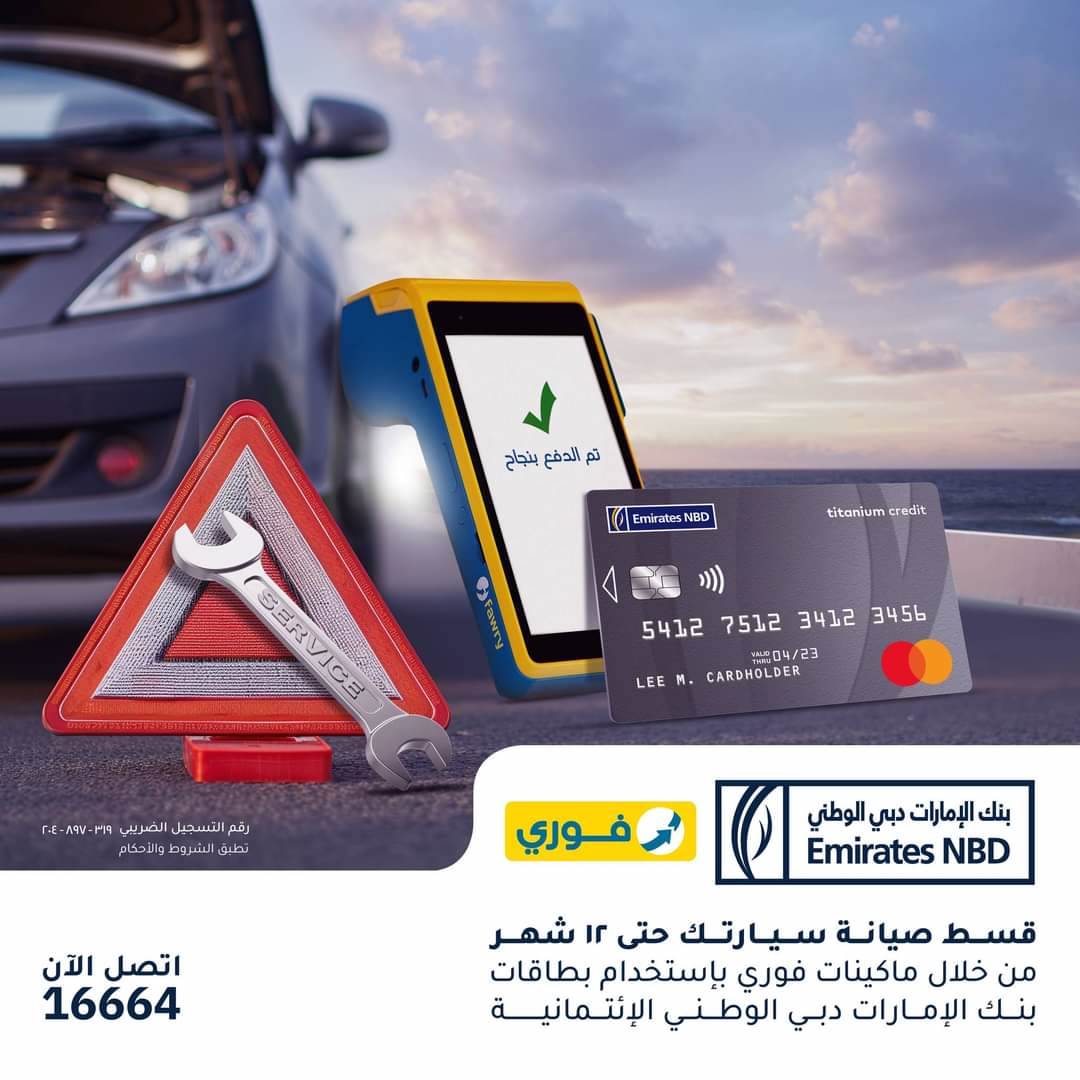 يُتيح بنك الإمارات دبي الوطني تقسيط صيانة السيارات، لعملائه حاملي البطاقات الإئتمانية، من خلال ماكينات نقاط البيع التابعة لفوري على 6 أو 12 شهر بدون فوائد،