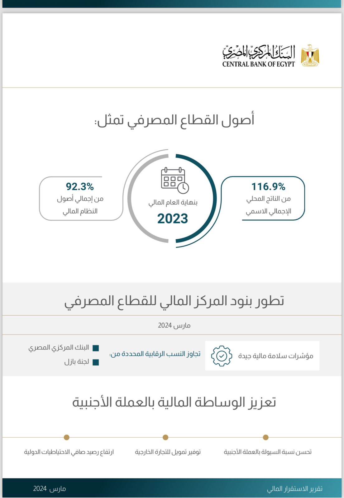 وأوضح التقرير أن أصول القطاع المصرفي تمثل 116.9٪ من الناتج المحلي الإجمالي الاسمي و92.3٪ من إجمالي أصول النظام المالي في نهاية العام المالي 2023، مشيرًا إلى تطور بنود المركز المالي للقطاع وتمتعه بمؤشرات سلامة مالية جيدة حتى مارس 2024، فضلًا عن تجاوز جميع النسب الرقابية المحددة من قبل البنك المركزي المصري ومتطلبات لجنة بازل بصورة كافية، وهو ما عزز ثقة المتعاملين مع القطاع.
