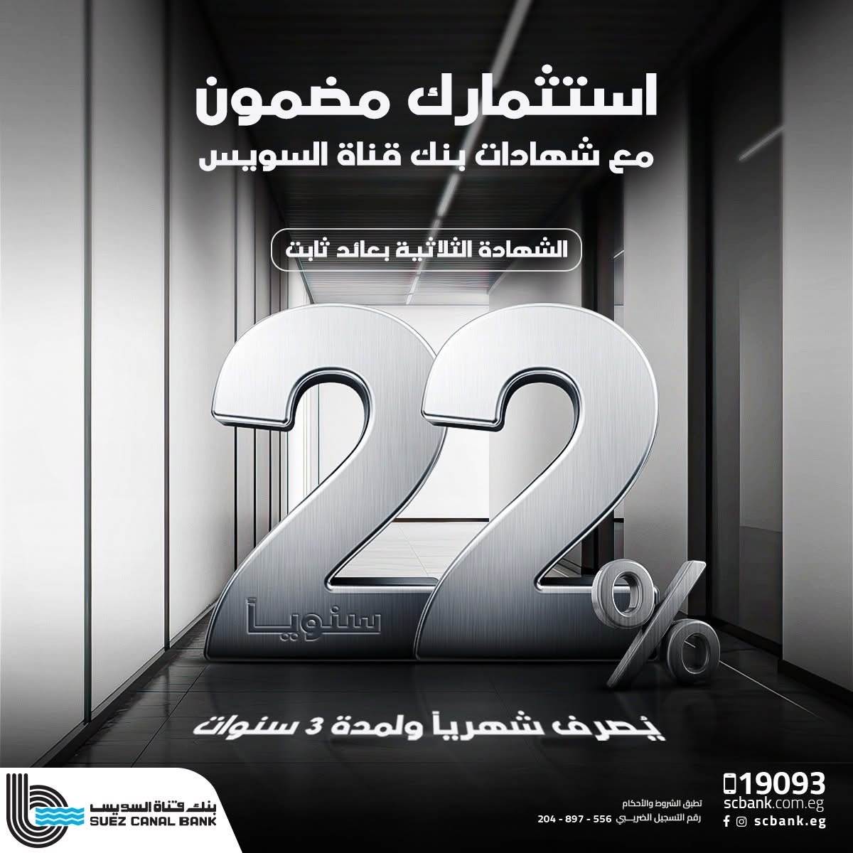 بنك قناة السويس يُقدم الشهادة الثلاثية الثابتة بفائدة 22% سنويًا