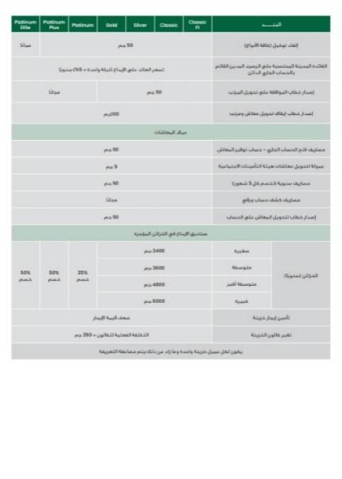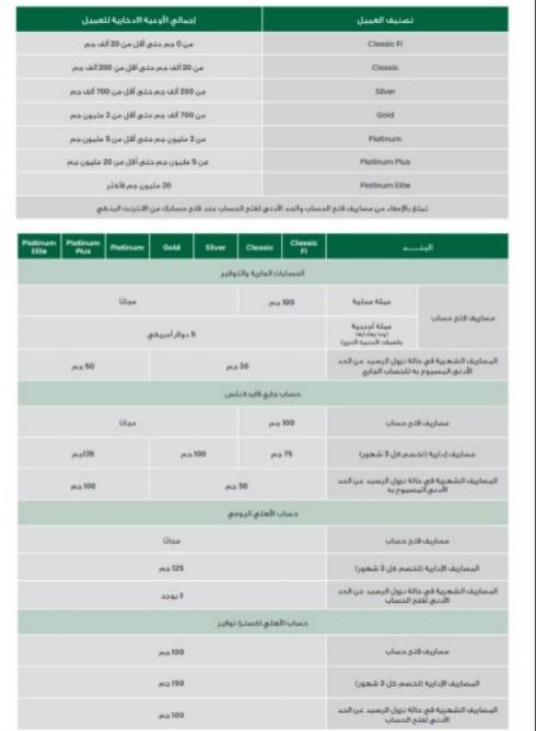- فتح الحساب: 100 جنيه لعملاء فئة Classic FI و Classic ومجانا لباقي فئات العملاء.