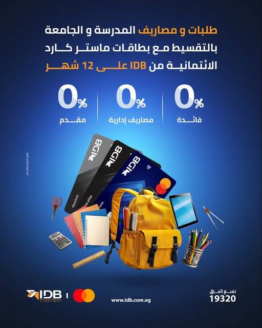 يتيح بنك التنمية الصناعية-IDB لعملائه إمكانية استخدام بطاقات ماستركارد الائتمانية لسداد مصاريف التعليم واحتياجات المدرسة والجامعة، مع التمتع بتقسيط المبالغ المستحقة على فترة سداد تصل إلى 12 شهرا، وذلك دون فوائد أو مصاريف أو مقدم؛ إذ يهدف هذا التسهيل إلى دعم العملاء في إدارة التزاماتهم التعليمية بصورة أكثر مرونة ومن دون أعباء مالية إضافية.