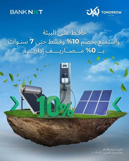 في إطار دعمه للاستدامة وتشجيع العملاء على استخدام حلول الطاقة النظيفة، أعلن بنك نكست عن إتاحة عرض مميز يتيح للعملاء شراء مجموعة من الأجهزة الصديقة للبيئة من Tomorrow بخصم يصل إلى 10%، مع إمكانية التقسيط الميسر حتى 7 سنوات وبدون أي مصاريف إدارية.