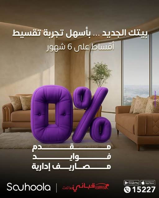 تقدم شركة "سهولة" للتمويل الاستهلاكي عرضا تمويليا حصريا يتيح للعملاء تقسيط الأثاث من "قباني" على مدار فترة سداد تصل إلى 6 أشهر، وذلك بدون مقدم، ودون أية فوائد أو مصاريف إدارية، من خلال خطة سداد مرنة تساعد على إدارة النفقات بسهولة وراحة.