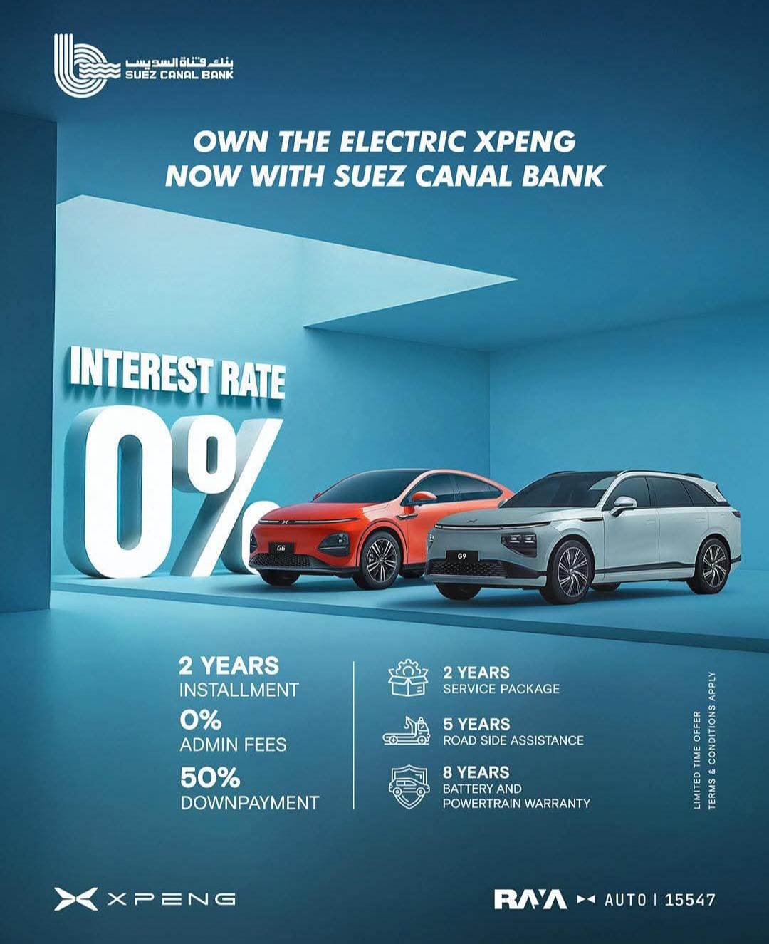 يتيح بنك قناة السويس، بالتعاون مع شركة “XPENG” لعملائه إمكانية امتلاك السيارة الكهربائية G6 أو G9 بتمويل حصري بدون فائدة أو مصاريف إدارية، وتقسيط مريح على 24 شهرا، مع دفعة مقدمة تبلغ 50%، وضمان “باورترين”، حيث يشمل العرض تأمين على الحياة مجاني طوال فترة القرض وتأمين السيارة اختياري، مع تطبيق باقي شروط وأحكام قروض السيارات من البنك.