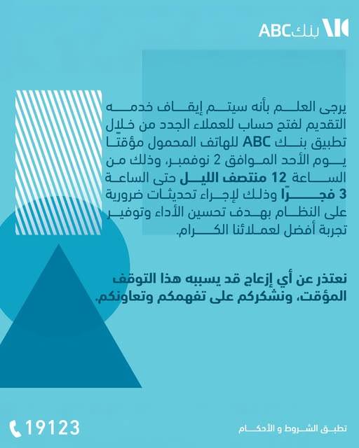 ينوه بنك ABC عملائه الكرام بأنه سيتم إيقاف خدمة التقديم لفتح حسابات للعملاء الجدد من خلال تطبيق بنك ABC للهاتف المحمول مؤقتًا يوم الأحد الموافق 2 نوفمبر، وذلك في الفترة من الساعة 12 منتصف الليل وحتى الساعة 3 فجراً، لإجراء تحديثات ضرورية على النظام, يأتي هذا الإجراء ضمن جهود البنك المستمرة لتحسين الأداء وتقديم تجربة مصرفية أكثر سلاسة وراحة للعملاء.