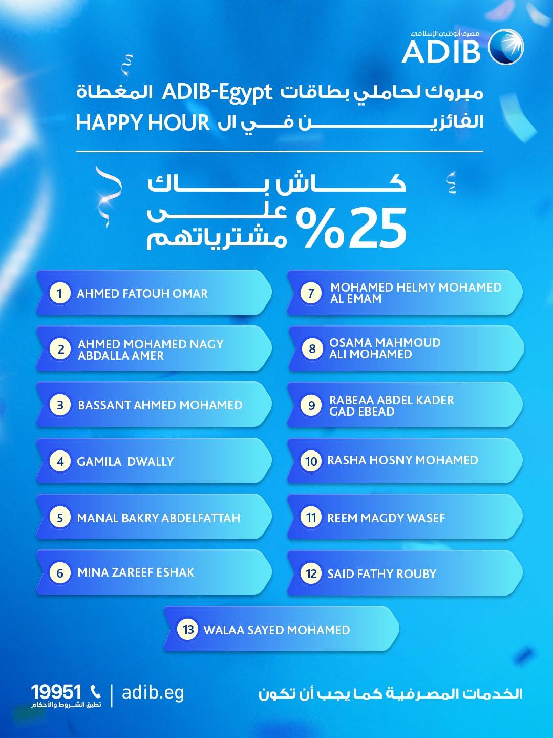يعلن مصرف أبو ظبي الإسلامي – مصر عن أسماء الفائزين من حاملي بطاقات ADIB-Egypt الذين استمتعوا بعرض "Happy Hour" وحصلوا على كاش باك بنسبة 25٪ على مشترياتهم, ويأتي هذا العرض ضمن سلسلة الفعاليات الترويجية التي يقدمها المصرف لعملائه المميزين طوال شهر نوفمبر، بهدف منحهم تجربة تسوق ممتعة ومجزية, كن مستعدًا للاستفادة من نفس الفرصة في أيام الجمع القادمة، حيث يمكنك الحصول على كاش باك 25٪ على مشترياتك، والاستمتاع بمزايا حصرية تقدمها بطاقات ADIB-Egypt، لتجعل كل عملية شراء تجربة فريدة ومجزية.