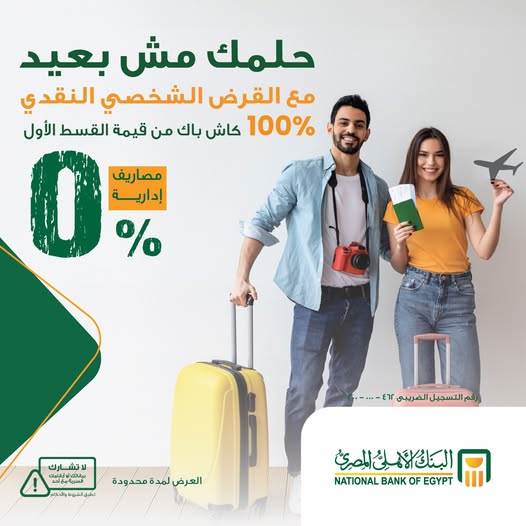 أعلن البنك الأهلي المصري-NBE عن إطلاق عرض جديد يتيح للعملاء الحصول على قرض شخصي بدون أي مصاريف إدارية، مع فرصة استرداد كامل قيمة القسط الأول بنسبة 100% كاش باك؛ وذلك في إطار حرص البنك على تمكين العملاء من تحقيق أحلامهم بسهولة ومرونة، وتوفير حلول تمويلية مريحة تلبي احتياجاتهم المالية المختلفة.