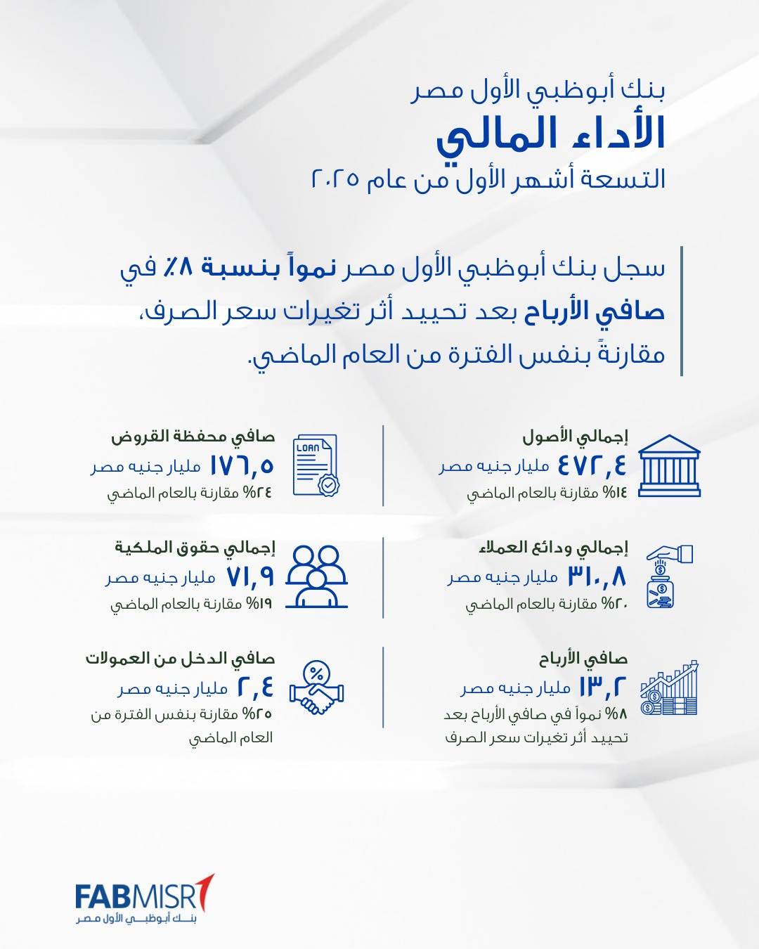بنك أبوظبي الأول مصر يحقق نموًا بنسبة 8% في صافي الأرباح خلال التسعة أشهر من عام 2025 بعد تحييد أثر تغيرات سعر الصرف