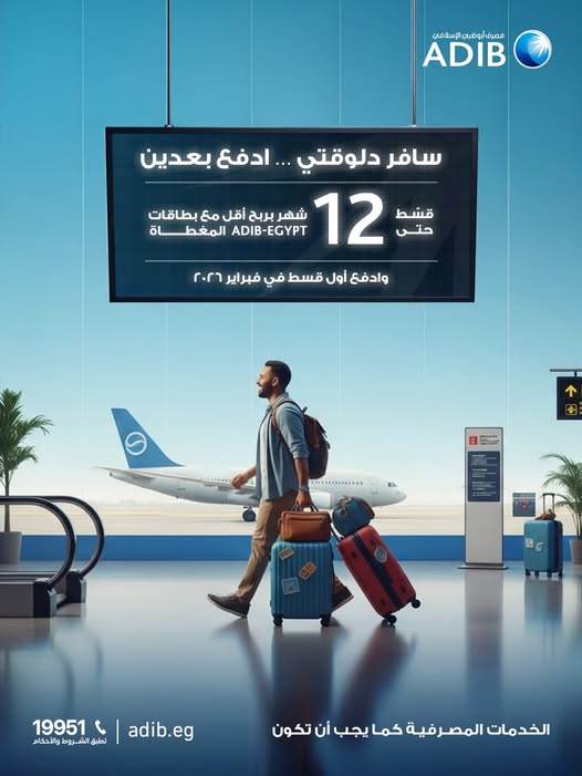 يقدم مصرف أبو ظبي الإسلامي-ADIB أن يقدم لعملائه حاملي بطاقات ADIB-Egypt المغطاة عرضًا مميزًا يتيح لهم حجز رحلاتهم داخل مصر بكل سهولة ويسر, حيث يمكن الاستمتاع بفرصة السفر إلى وجهاتك المفضلة داخل البلاد، مع إمكانية تقسيط المبلغ على 6 أو 12 شهرًا، مما يجعل التخطيط لرحلتك أكثر مرونة, ممع ميزة معدل الربح المنخفض، مما يضمن لك تجربة سفر مريحة دون ضغوط مالية, بالإضافة إلى ذلك، يمكنك بدء سداد أول قسط من المبلغ في فبراير 2026، مما يمنحك الوقت الكافي لتنظيم ميزانيتك والاستعداد للرحلة.