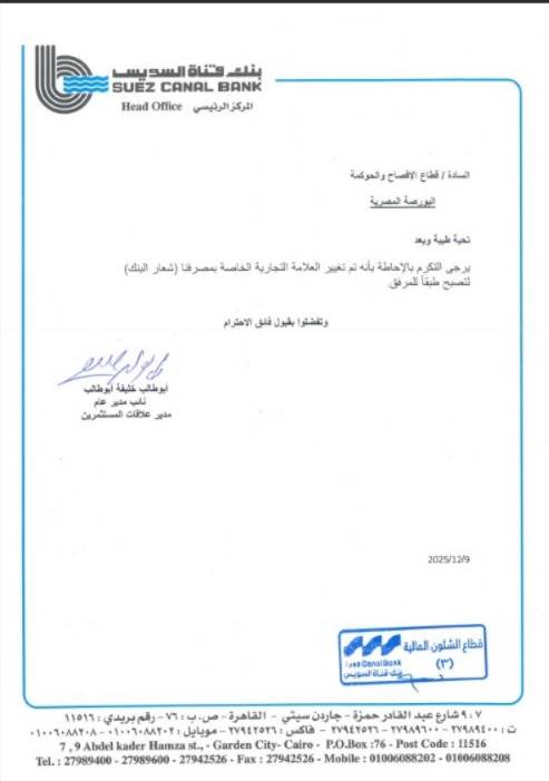 أوضح بنك قناة السويس في افصاح للبورصة المصرية اليوم الأربعاء أنه تم تغيير العلامة التجارية " شعار البنك" وذلك وفقا لبيان البورصة المصرية.
