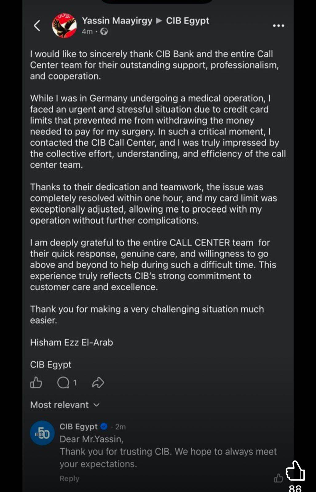 توجّه أحد عملاء البنك التجاري الدولي – مصر (CIB) بخالص الشكر والتقدير للبنك ولفرق مركز الاتصال، كما وجّه الشكر بشكل خاص إلى هشام عز العرب، الرئيس التنفيذي وعضو مجلس الإدارة التنفيذي، مثمنًا الدور المؤسسي والقيادي الذي ينعكس في جودة الخدمة المقدّمة للعملاء، خاصة في المواقف الإنسانية الحرجة.