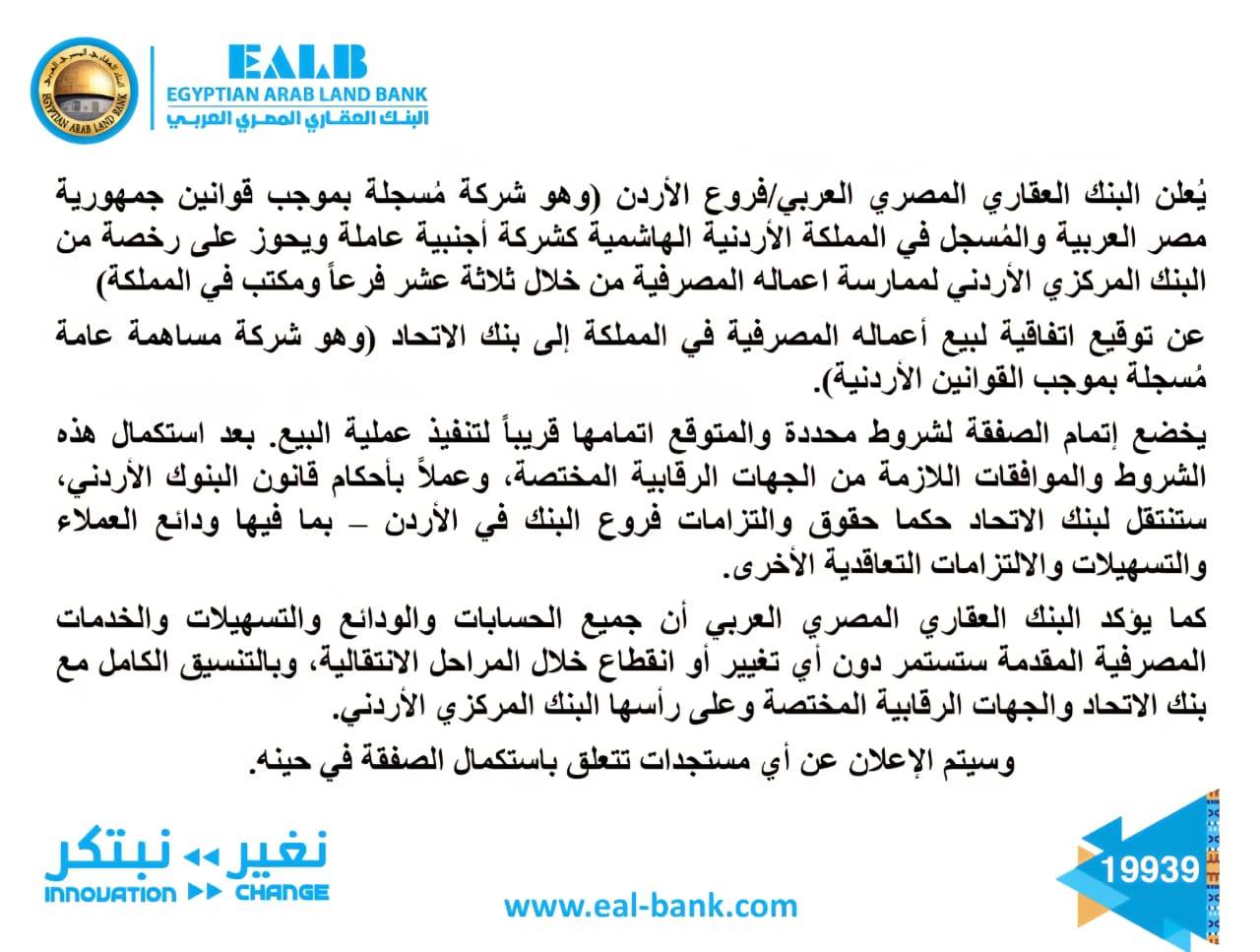 أعلن البنك العقاري المصري العربي، فرع الأردن (وهو شركة مسجلة بموجب قوانين جمهورية مصر العربية والمسجل في المملكة الأردنية الهاشمية كشركة أجنبية عاملة ويحوز على رخصة من البنك المركزي الأردني لممارسة اعماله المصرفية من خلال ثلاثة عشر فرعا ومكتب في المملكة)، عن توقيع اتفاقية لبيع أعماله المصرفية في المملكة إلى بنك الاتحاد (وهو شركة مساهمة عامة مُسجلة بموجب القوانين الأردنية).