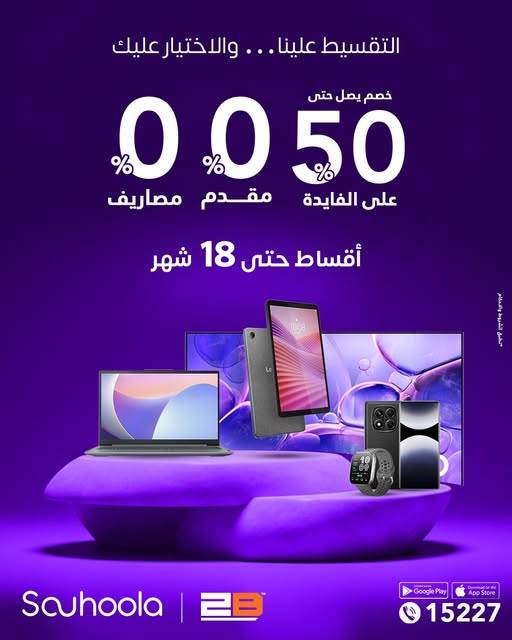 تتيح شركة “سهولة” للتمويل الاستهلاكي لعملائها إمكانية تقسيط المشتريات من “2B” لمدة تصل إلى 18 شهرا بدون دفع مقدم أو أي مصاريف إدارية، مع إمكانية الحصول على خصم يصل إلى 50% على الفائدة.