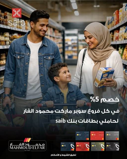أعلن بنك saib عن إطلاق عرض حصري لعملائه يتيح لهم الاستفادة من خصم 5% على جميع المشتريات من سوبر ماركت محمود الفار عند الدفع باستخدام بطاقات saib الائتمانية أو بطاقات الخصم المباشر من Mastercard، وذلك في إطار حرص البنك على تقديم مزايا حقيقية تدعم احتياجات العملاء اليومية، ويستمر العرض اعتبارًا من 1 يناير 2026 وحتى 31 مارس 2026، ليمنح العملاء فرصة التوفير عند شراء احتياجات المنزل اليومية بكل سهولة وأمان.