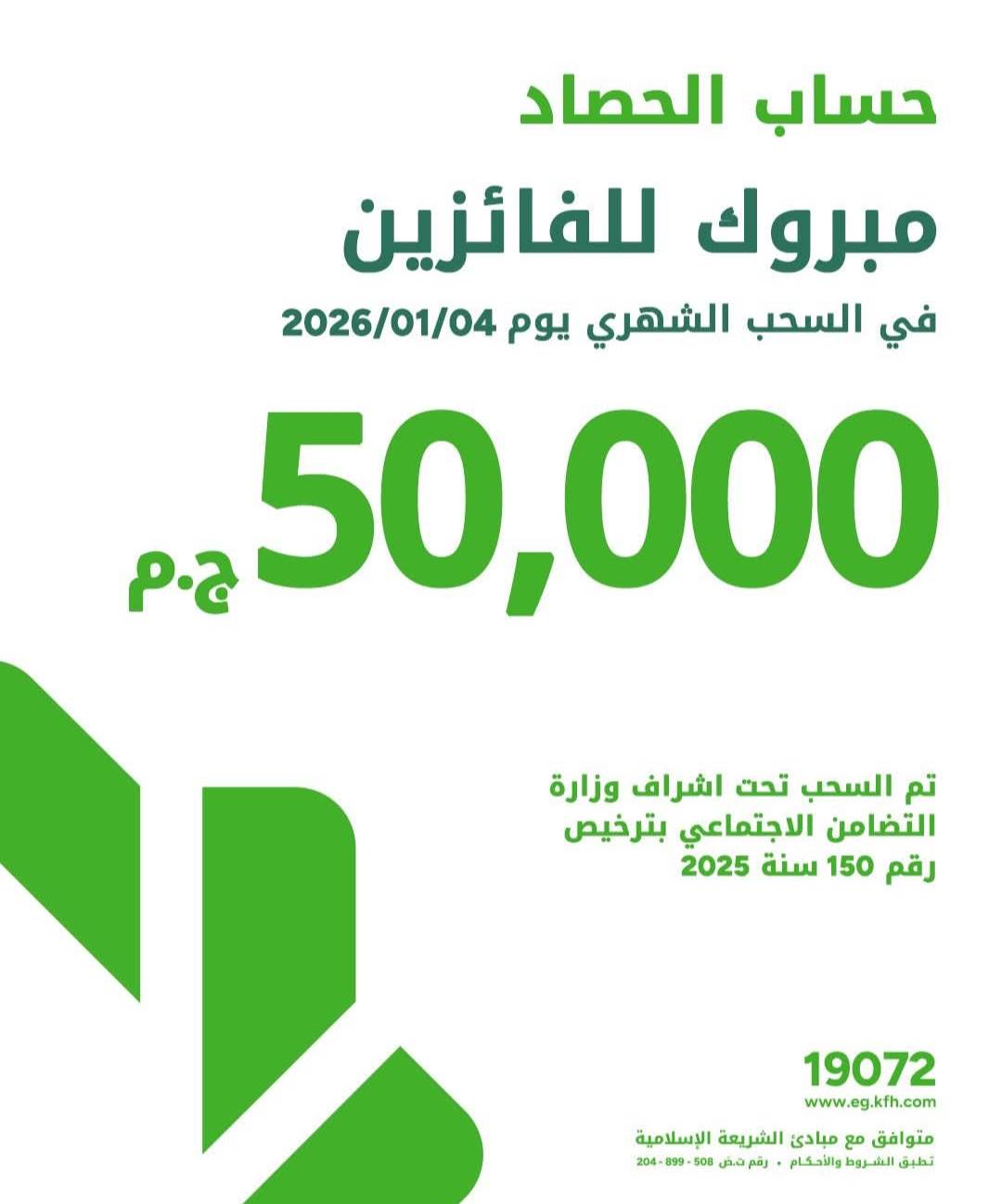 • للتأهل للسحوبات: يجب الحفاظ على متوسط رصيد لا يقل عن 50000 جنيه.