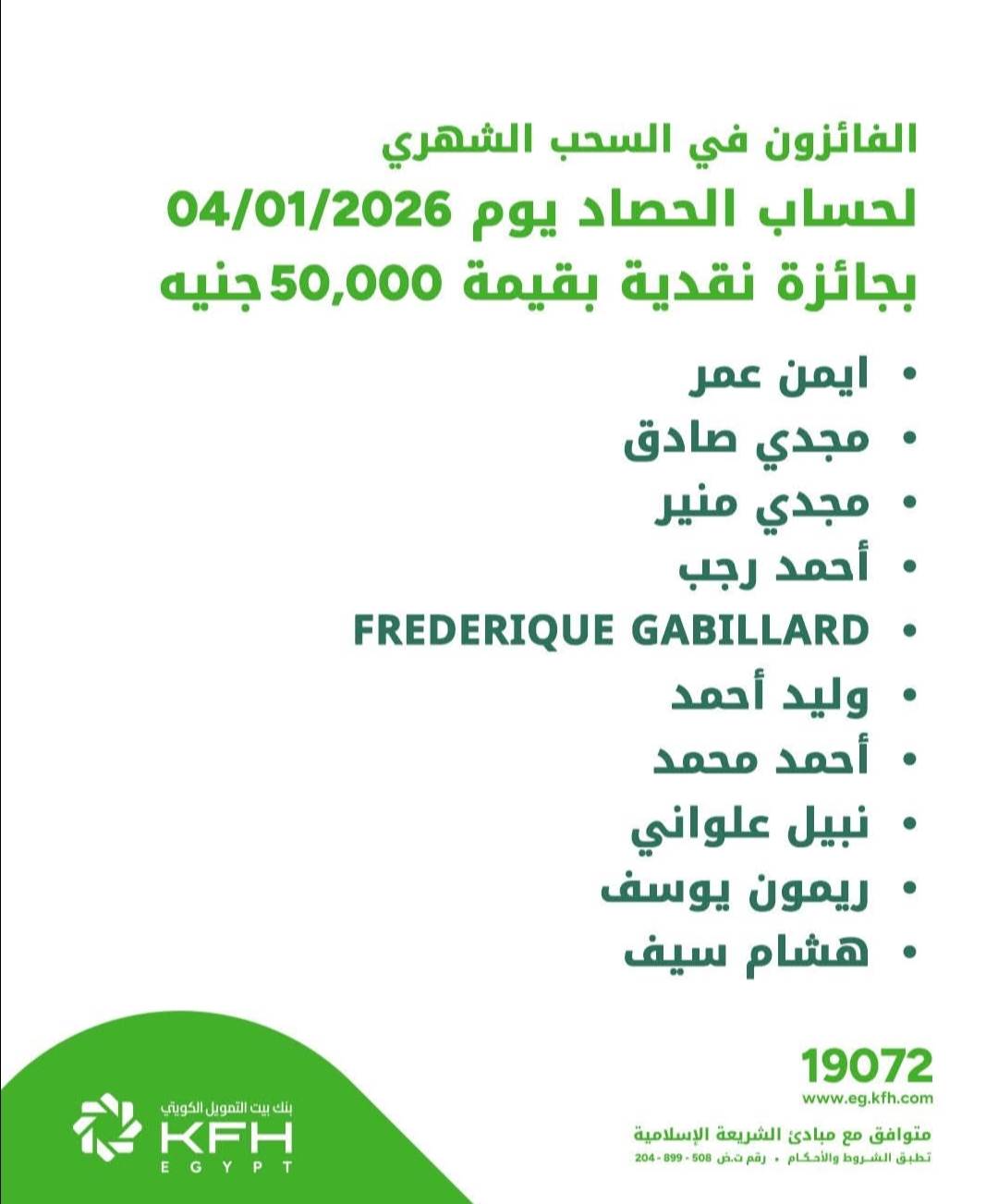 أعلن بنك بيت التمويل الكويتي- مصر عن أسماء الفائزين في السحب الشهري لحساب الحصاد الذي أقيم اليوم، حيث حصل كل فائز على جائزة نقدية قدرها 50.000 جنيه، فيما يوفر البنك حساب الحصاد بمزايا عديدة، منها عائد سنوي متوقع بنسبة 10% يُصرف شهريا بناءً على أقل رصيد خلال الشهر، مع حد أدنى لفتح الحساب يبلغ 5000 جنيه، وللتأهل للسحوبات، يجب الحفاظ على متوسط رصيد لا يقل عن 50000 جنيه، فيما تزداد فرص الفوز كلما طالت مدة الاحتفاظ بالرصيد.