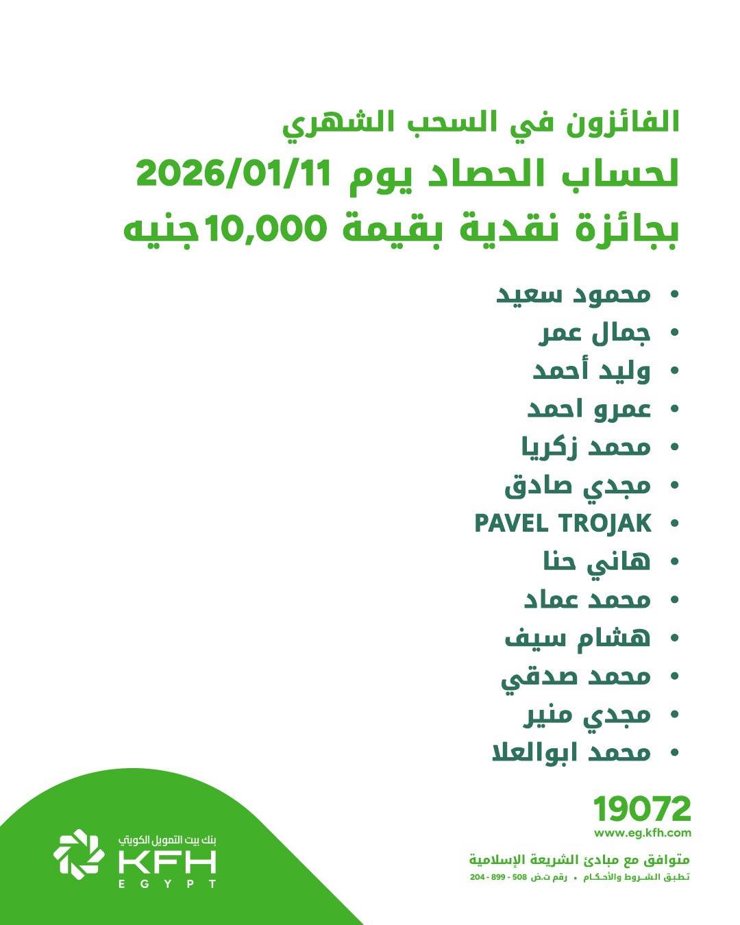 أسماء الفائزين في السحب الأسبوعي لحساب الحصاد من بنك بيت التمويل الكويتي- مصر
