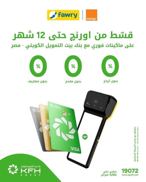 بنك بيت التمويل الكويتي مصر يتيح التقسيط بدون أرباح حتى 12 شهرا عبر ماكينات فوري من فروع "Orange"