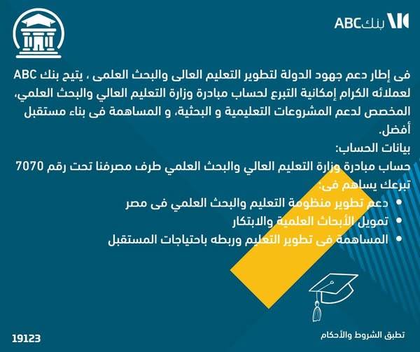 يتيح بنك ABC مصر لعملائه فرصة المشاركة في دعم تطوير التعليم العالي والبحث العلمي من خلال التبرع لحساب مبادرة وزارة التعليم العالي والبحث العلمي؛ حيث يمكن للعملاء المساهمة مباشرة من البنك عبر حساب المبادرة رقم 7070، لتكون مساهمتهم جزءً من جهود الدولة في دعم المشروعات التعليمية والبحثية, والمساهمةفي بناء مستقبل أفضل.