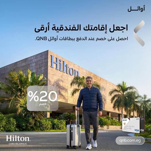 يتيح بنك QNB مصر لعملائه فرصة فريدة للاستمتاع بتجربة فندقية راقية في فندق Hilton Cairo Heliopolis، مع خصم يصل إلى 20%، وذلك عند الدفع ببطاقات أوائل QNB الائتمانية، سواء للإقامة أو لتناول أشهى المأكولات في المطاعم داخل الفندق، في تجربة استثنائية تجمع بين الرفاهية والراحة بأسلوب أنيق.