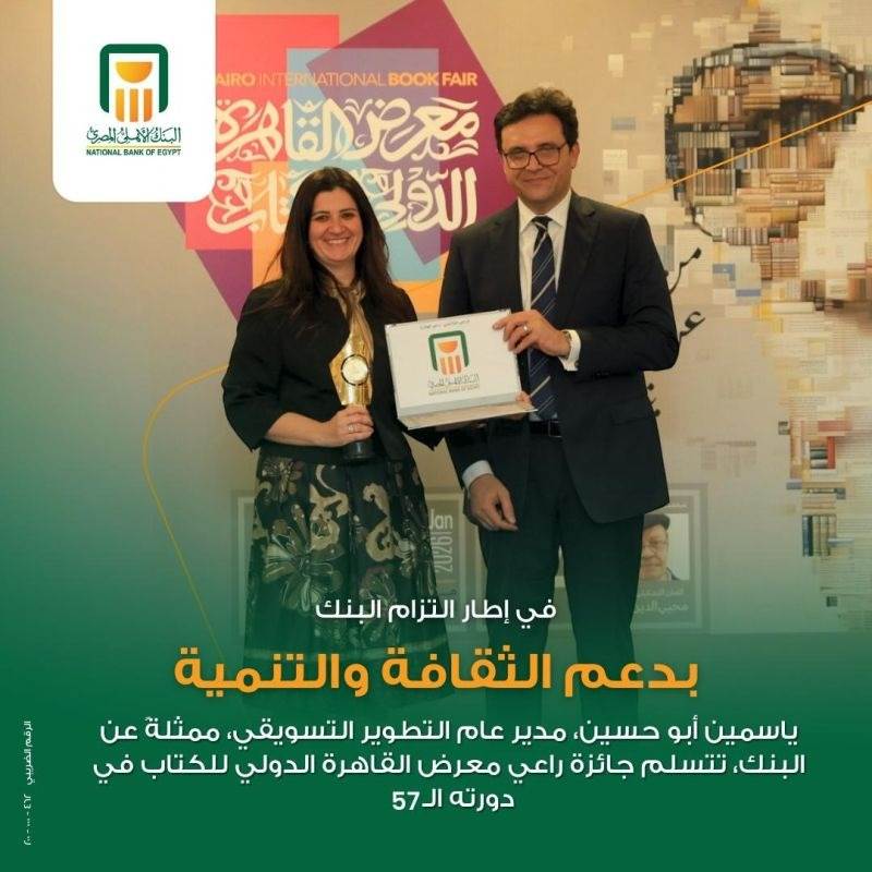 تسلم البنك الأهلي المصري-NBE جائزة راعي معرض القاهرة الدولي للكتاب في دورته السابعة والخمسين، تقديرا لدوره الرائد في رعاية أكبر حدث ثقافي على مستوى المنطقة العربية، وفي إطار التزامه المستمر بدعم الثقافة والفنون.