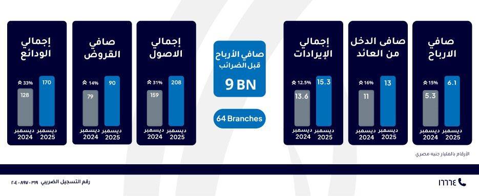 وعلى مستوى المركز المالي، ارتفعت إجمالي الأصول لتصل إلى 208 مليار جنيه بنهاية ديسمبر 2025 مقابل 159 مليار جنيه بنهاية ديسمبر 2024 بمعدل نمو31%، فيما ارتفعت حقوق الملكية لتصل إلى 23 مليار جنيه بنهاية ديسمبر 2025 مقابل 17.4 مليار جنيه بنهاية ديسمبر 2024، محققة معدل نمو سنوي بلغ 32% ، وسجل العائد على متوسط حقوق الملكية (ROAE) 33%، والعائد على متوسط الأصول (ROAA) 3.6% ، بينما سجلت نسبة التكلفة إلى الدخل 30%.