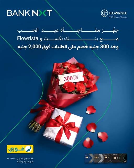 يقدم بنك نكست أحدث عروضه لعملائه بمناسبة عيد الحب، وذلك عند الدفع ببطاقة بنك نكست ستحصل على خصم 300 جنيه لدى Flowrista عند الطلب بقيمة 2000 جنيه أو أكتر استخدم كود الخصم: FVD300 من خلال: https://www.flowrista.com عند إتمام عملية الشراء.