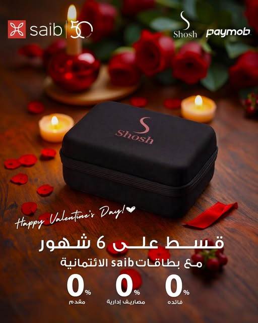 بنك saib يتيح أحدث عروضه بمناسبة عيد الحب، اذ يتيح الشراء من Shosh Arabia والتقسيط مع Paymob على 6 أشهر بدون فائدة أو مقدم أو مصاريف إدارية عند الدفع أونلاين ببطاقات saib الإئتمانية من ماستركارد، العرض سارى حتى نهاية فبراير 2026، الحد الأدني للمعاملة 500 جنيه.