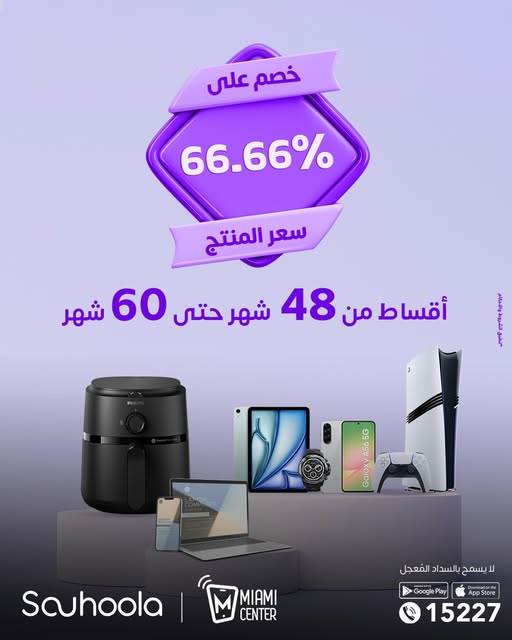 أعلنت شركة "سهولة "عن عرض استثنائي بالتعاون مع Miami Center، يتيح للعملاء شراء احتياجاتهم بخصم ضخم يصل إلى 66.66% من سعر المنتج، مع إمكانية التقسيط لفترات طويلة وبدون أعباء إضافية.
