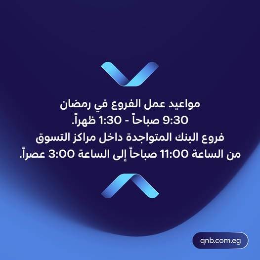 أعلن بنك QNB مصر عن تعديل مواعيد العمل الرسمية بجميع فروعه طوال شهر رمضان؛ حيث يحرص البنك على مواصلة تقديم خدماته المصرفية بكفاءة وسلاسة، مع مراعاة خصوصية الشهر الفضيل وتلبية احتياجات العملاء خلال أوقات العمل المناسبة.