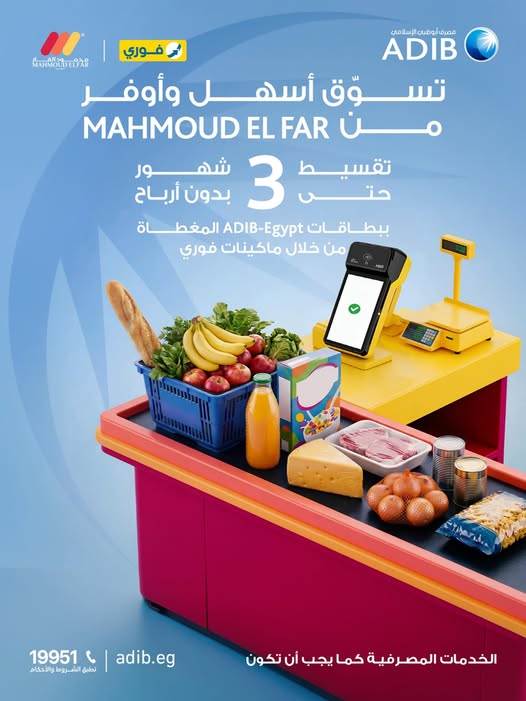 أعلن مصرف أبوظبي الإسلامي-ADIB عن إتاحة خدمة تقسيط مشتريات سوبر ماركت محمود الفار على 3 أشهر بدون أرباح، وذلك عند الدفع باستخدام بطاقات ADIB-Egypt المغطاة عبر ماكينات فوري.