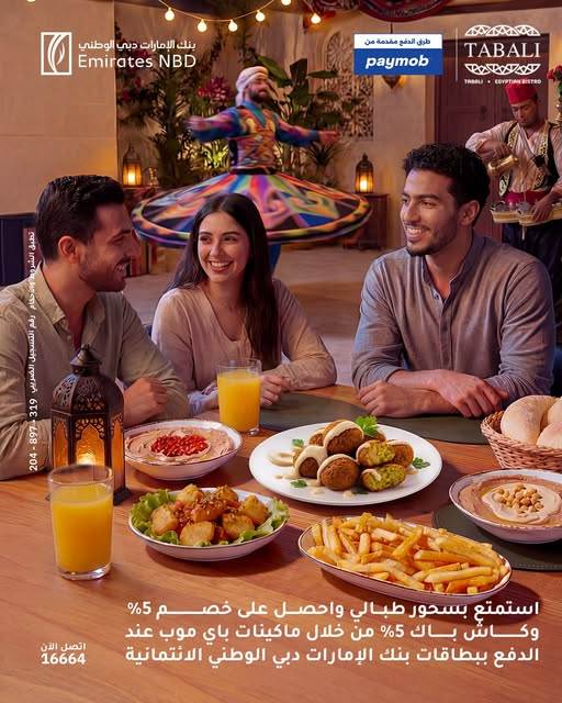 يأتي هذا العرض في إطار حرص بنك الإمارات دبي الوطني مصر على تقديم مزايا حصرية لعملائه وتعزيز تجربة الدفع ببطاقاته الائتمانية، من خلال إتاحة عروض وخصومات مميزة لدى عدد من المطاعم والعلامات التجارية، بما يمنح العملاء فرصة الاستمتاع بأجواء شهر رمضان وسحور مميز في Tabali مع تحقيق أقصى استفادة من خدمات البنك..