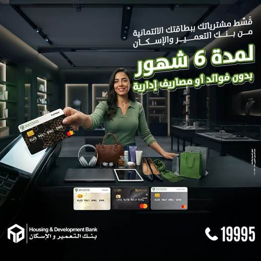يتيح بنك التعمير والاسكان-HD لعملائه من حاملي البطاقات الائتمانية الحاليين والجدد إمكانية إجراء المشتريات باستخدام بطاقاتهم الائتمانية من داخل أو خارج جمهورية مصر العربية، مع إمكانية تقسيط هذه المشتريات على مدة 6 أشهر بدون فوائد وبدون مصاريف إدارية، وذلك عند طلب التقسيط من خلال مركز خدمة العملاء خلال فترة الحملة.