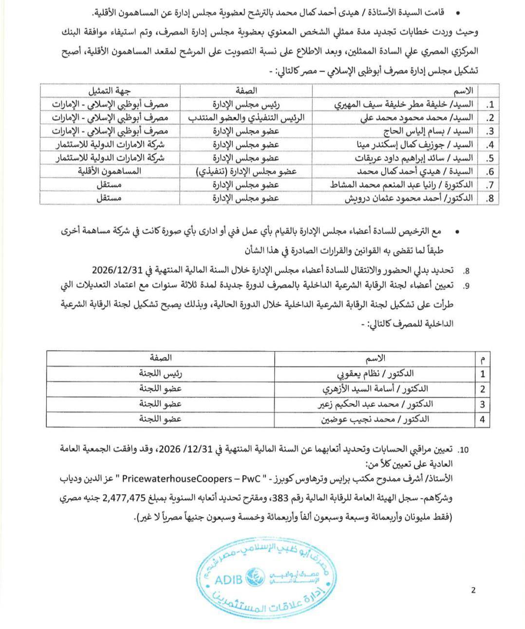 أشرف ممدوح مكتب برايس وترهاوس كوبرز - " Pricewaterhouse Coopers - PwC " عز الدين ودياب وشركاهم سجل الهيئة العامة للرقابة المالية رقم 383 ، ومقترح تحديد أتعابه السنوية بمبلغ 2,477,475 جنيه مصري فقط مليونان وأربعمائة وسبعة وسبعون ألفاً وأربعمائة وخمسة وسبعون جنيها مصرياً لا غير)، و الدكتور أحمد مصطفى شوقي مكتب مصطفى شوقي وشركاه - Forvis Mazars" - سجل الهيئة العامة للرقابة المالية رقم 5، ومقترح تحديد أتعابه السنوية بمبلغ 1,375,000 جنيه مصري فقط واحد مليون وثلاثمائة وخمسة وسبعون ألف جنيها مصريا لا غير، وذلك للقيام بأعمال المراجعة الحسابية للعام المالي للمصرف الذي ينتهي في 31 ديسمبر 2026، والأتعاب شاملة القيام بأعمال المراجعة الدورية للقوائم المالية طبقا لما جاء في مواد قانون البنك المركزي والجهاز المصر في رقم 194 لسنة 2020 ووفقا لمعايير المراجعة الدورية كل ثلاثة أشهر، مع التزام كل منهما بتحمل الضرائب المستحقة على تلك الأتعاب السنوية.