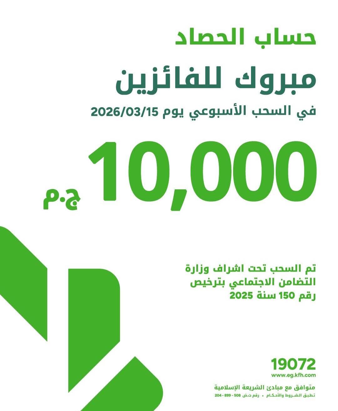 أعلن بنك بيت التمويل الكويتي- مصر عن أسماء الفائزين في السحب الأسبوعي لحساب الحصاد الذي أقيم يوم 15-3-2026، حيث حصل كل فائز على جائزة نقدية قدرها 10000 جنيه ويوفر البنك حساب الحصاد بمزايا عديدة، منها عائد سنوي متوقع بنسبة 8% يُصرف شهريًا بناءً على أقل رصيد خلال الشهر، مع حد أدنى لفتح الحساب يبلغ 5000 جنيه, ولتأهل للسحوبات، يجب الحفاظ على متوسط رصيد لا يقل عن 50000 جنيه، وتزداد فرص الفوز كلما طالت مدة الاحتفاظ بالرصيد ويُعتبر الحساب خيارًا استثماريًا متوافقًا مع أحكام الشريعة الإسلامية، مما يمنح العملاء فرصة للادخار المنتظم مع عوائد مجزية وفرص للفوز بجوائز نقدية تُسحب بشكل دوري.