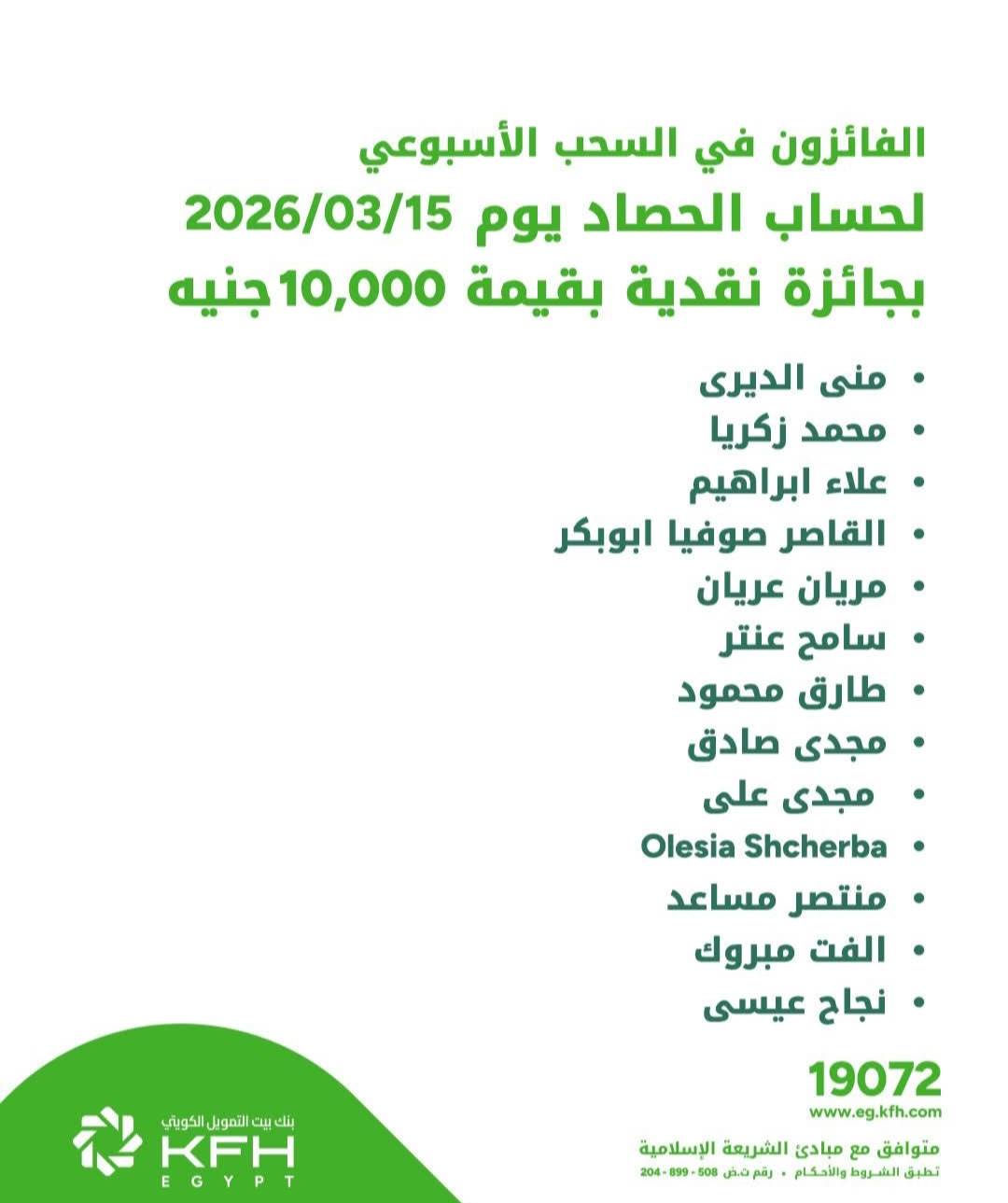 بنك بيت التمويل الكويتي- مصر يعلن أسماء الفائزين في السحب الأسبوعي لحساب "الحصاد"