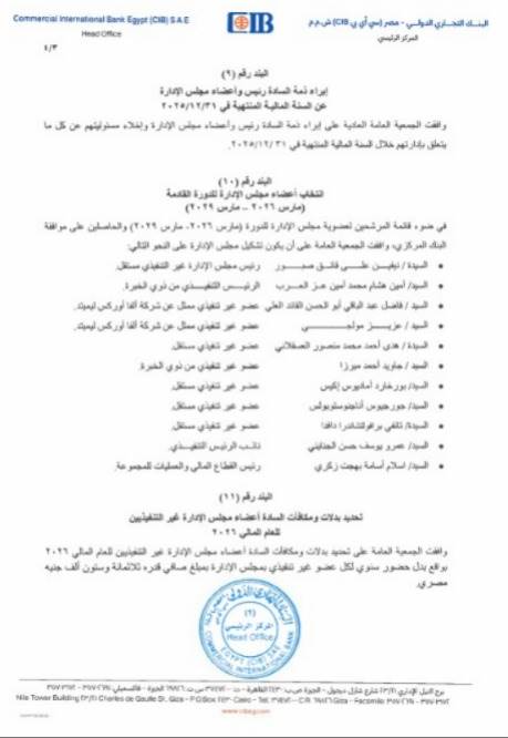 اعتمد الجمعية العامة العادية للبنك التجاري الدولي CIB مصر تشكيل مجلس إدارة البنك لمدة 3 سنوات جديدة تبدأ في مارس 2026 - مارس 2029 ، وذلك بعد الحصول على موافقة البنك المركزي المصري.