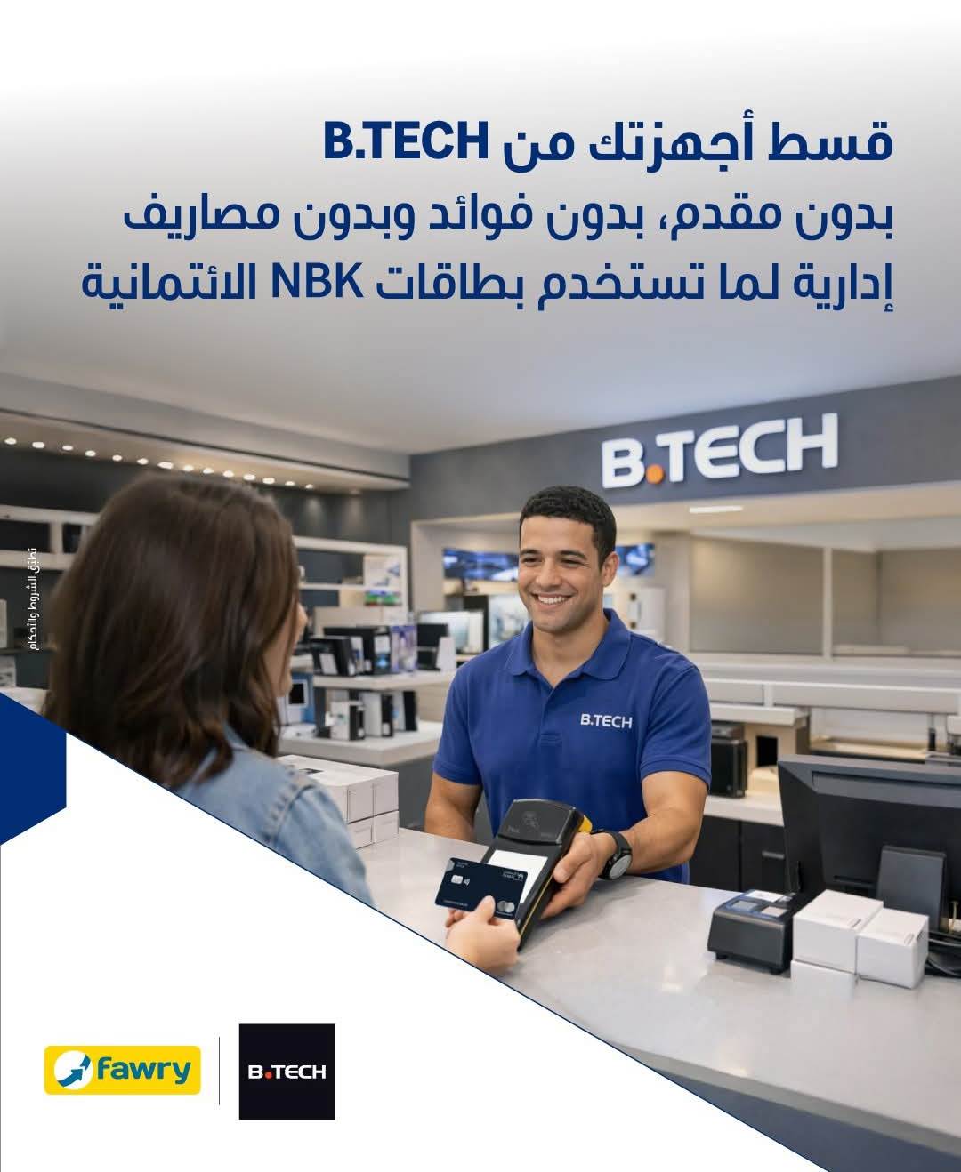 يتيح بنك الكويت الوطني – مصر لعملائه الاستفادة من عرض مميز لتقسيط مشترياتهم من “B.Tech” لمدة 12 شهرا بدون فوائد، عند استخدام البطاقات الائتمانية للبنك عبر ماكينات Fawry، مما يوفر تجربة تسوق مرنة وسهلة مع الحفاظ على الراحة المالية للعملاء.