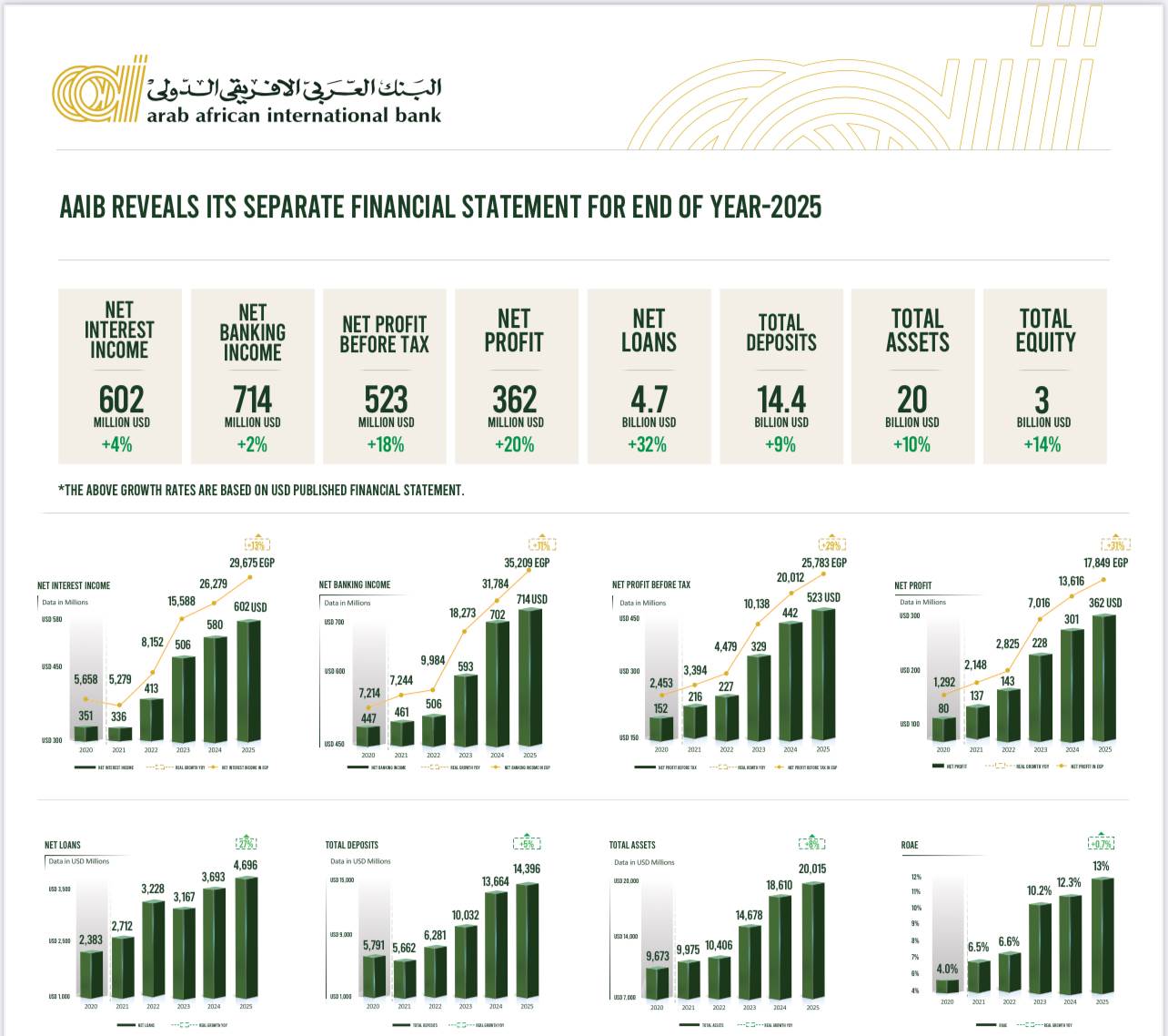 Arab African International Bank (AAIB) announced strong financial results for the year ending 31 December 2025, delivering solid profitability and balance sheet growth despite an easing interest rate environment. Commenting on this Tamer Waheed Vice-Chairman and Managing Director stated: As we close 2025, we have completed one of the most significant institutional turnarounds in just under three years. During this period, the Bank successfully regained its market presence and materially increased its market share. Total assets more than doubled to exceed USD 20 billion, while net profits rose to levels of USD 300+ million, compared to previous levels of USD 100+ million — representing more than a six-fold increase in peer-comparable local currency terms. At the same time, we restored our return on equity comfortably back into double-digit territory.