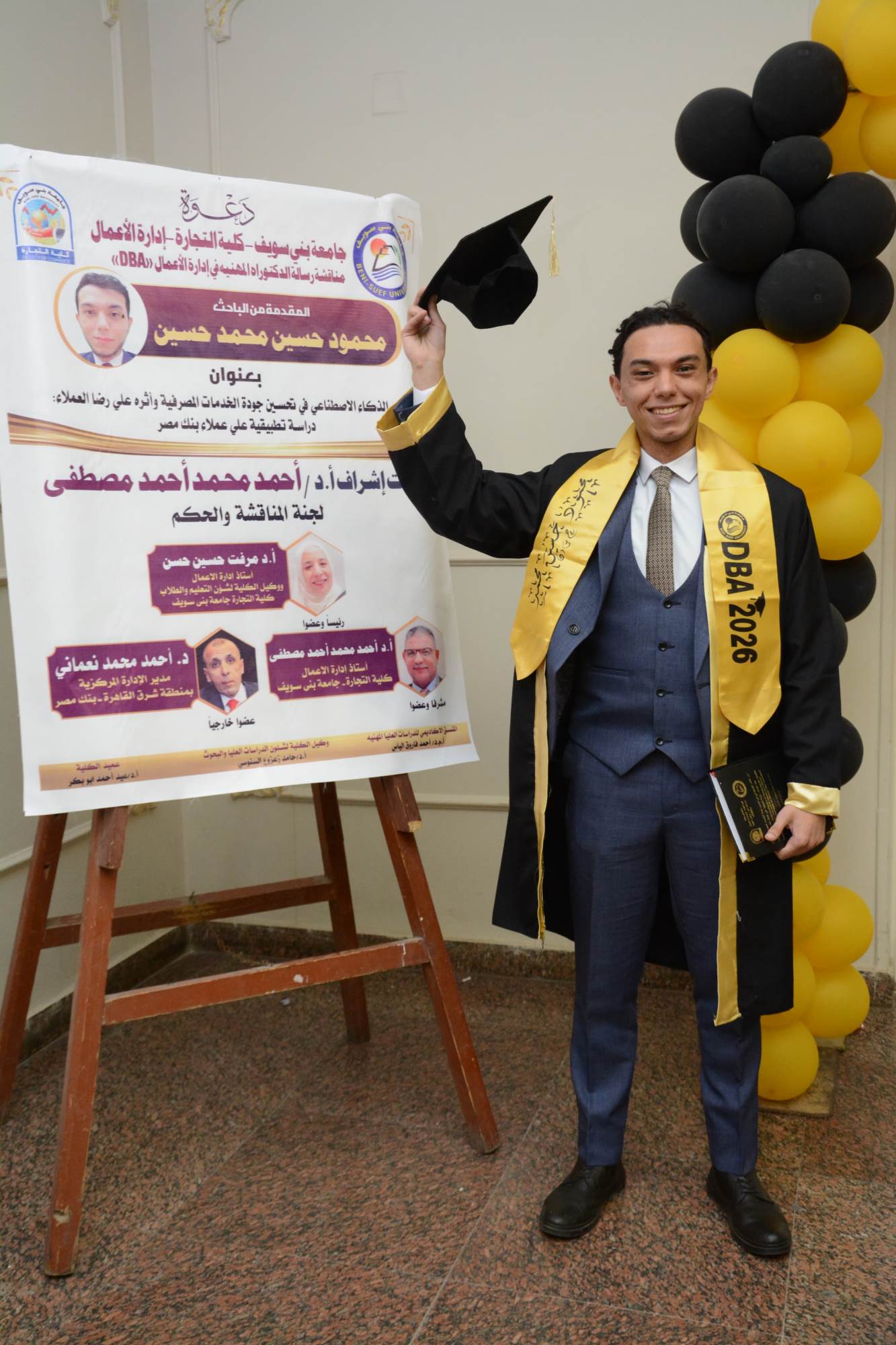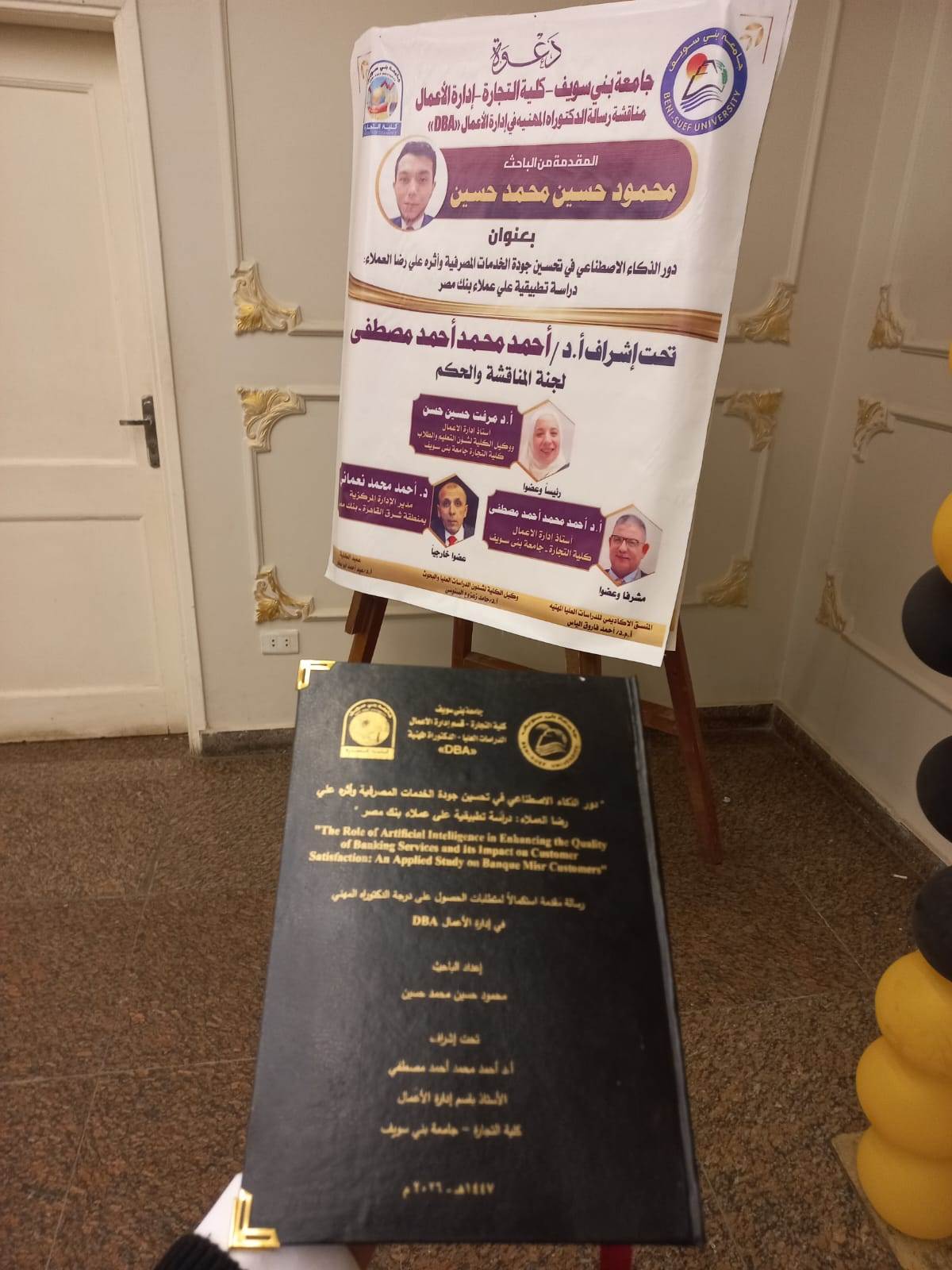 شهدت كلية التجارة بجامعة بني سويف، يوم الأحد الموافق 29 مارس 2026، مناقشة رسالة الدكتوراه المهنية في إدارة الأعمال (DBA) للباحث محمود حسين محمد، العامل بقطاع الائتمان في بنك مصر، والذي يُعد من أصغر الحاصلين على درجة الدكتوراه في هذا المجال بعمر 27 عامًا.