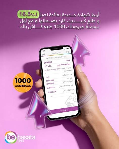 أعلنت منصة QNB Bebasata الرقمية عن طرح عرض جديد يستهدف عملاء الشهادات الادخارية، سواء الجدد أو الحاليين، وذلك في إطار تعزيز استخدام الحلول البنكية الرقمية وتقديم مزايا مالية تنافسية. ويتيح العرض للعملاء فرصة الحصول على كاش باك يصل إلى 1000 جنيه عند إصدار بطاقة ائتمانية بضمان الشهادة، بما يعكس توجه البنك نحو تقديم قيمة مضافة وتجربة مصرفية أكثر مرونة وسهولة