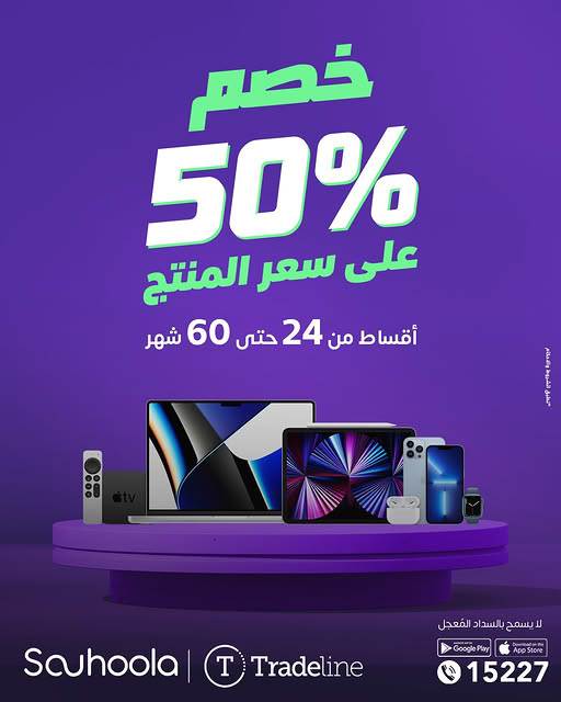 في خطوة جديدة لتعزيز القوة الشرائية وتسهيل امتلاك أحدث الأجهزة التكنولوجية، أعلنت شركة Souhoola بالتعاون مع Tradeline عن عرض استثنائي يتيح خصمًا يصل إلى 50% على جميع منتجات Apple، مع أنظمة تقسيط ميسّرة تصل إلى 60 شهرًا وبدون أي مقدم أو مصاريف إضافية، وذلك لفترة محدودة.