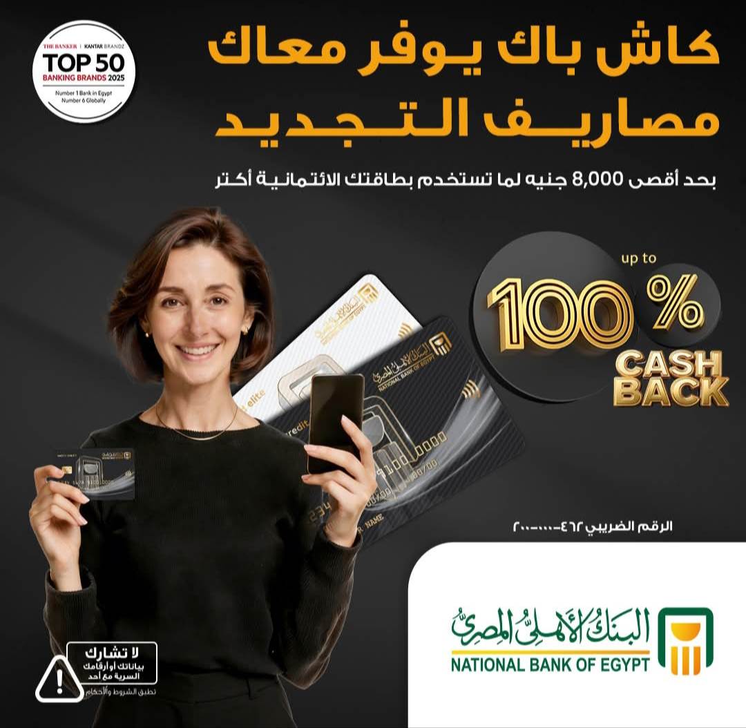 يتيح البنك الأهلي المصري-NBE لعملائه من حاملي البطاقات الائتمانية الاستفادة من عرض كاش باك يصل إلى 8000 جنيه لسداد رسوم تجديد البطاقات، وذلك في إطار سعي البنك إلى تقديم مزايا إضافية لعملائه وتشجيعهم على الاستفادة من خدمات البطاقات الائتمانية بطريقة أكثر مرونة وتوفيرا.