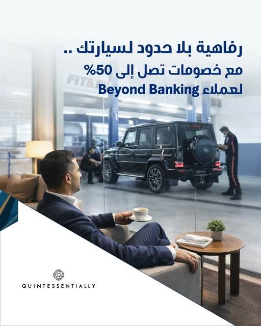 ويأتي هذا العرض ضمن باقة المزايا الحصرية التي يوفرها البنك لعملائه المميزين NBK Beyond Banking ، حيث يمكنهم الاستفادة من خدمات متكاملة للعناية بالسيارات بأفضل الأسعار، في إطار تجربة تجمع بين الراحة والرفاهية، من خلال الشراكة مع Quintessentially حيث يحصل العملاء على تجربة فريدة تشمل مساعدًا شخصيًا متاحًا على مدار الساعة طوال أيام الأسبوع، إلى جانب إمكانية الوصول إلى مجموعة واسعة من المزايا والخصومات على المطاعم والفنادق ورحلات الطيران، بالإضافة إلى خدمات الصحة والرفاهية داخل وخارج مصر.
